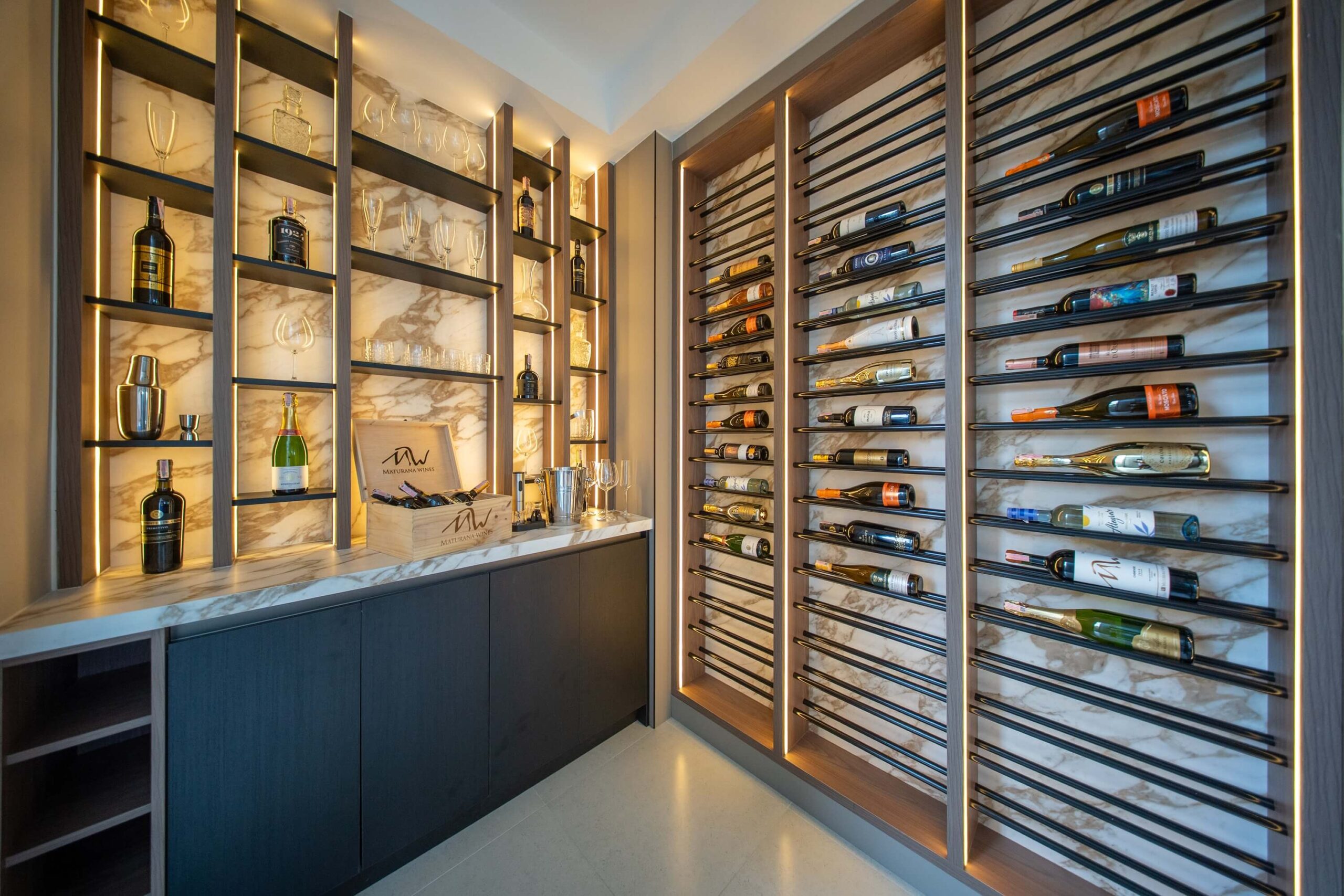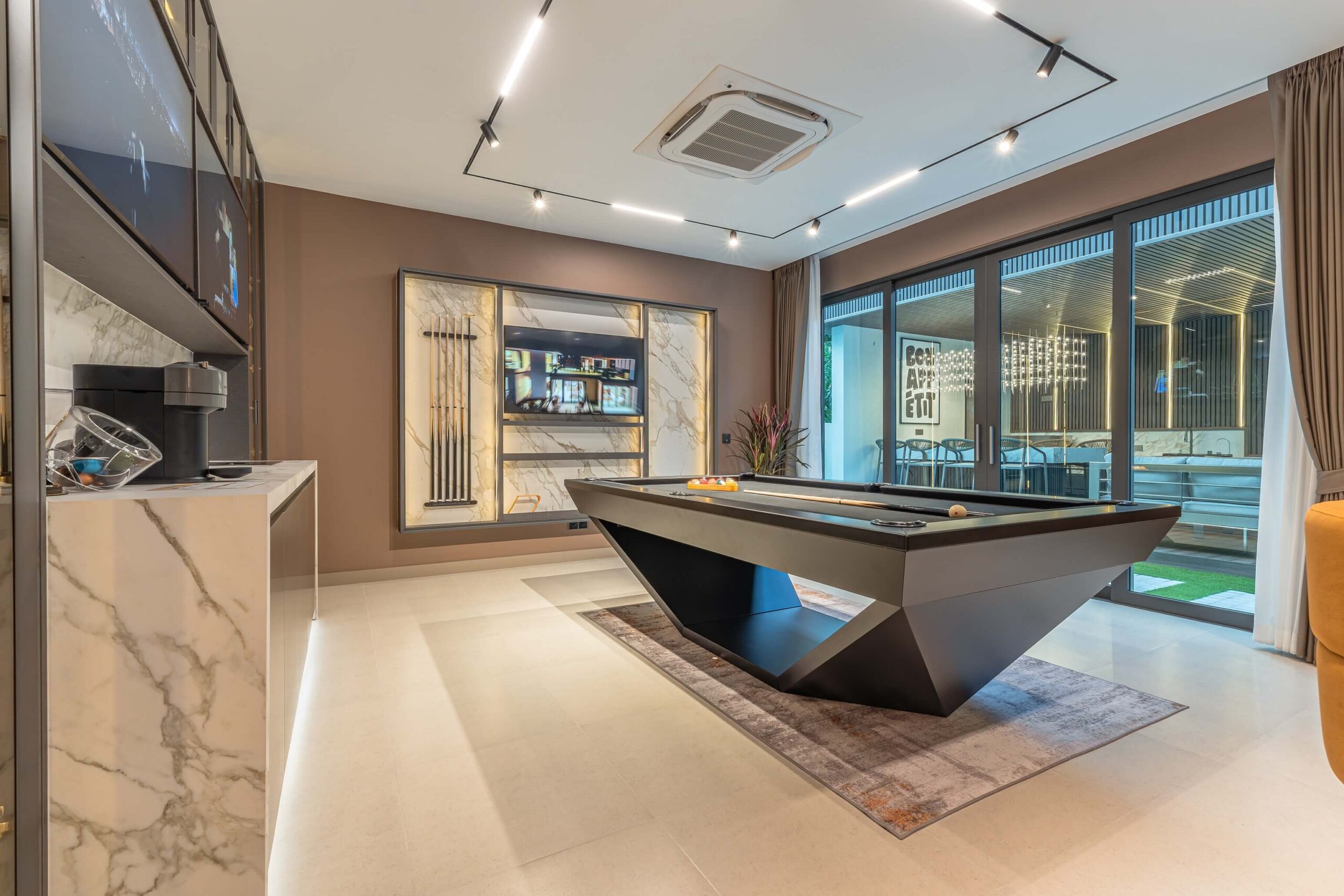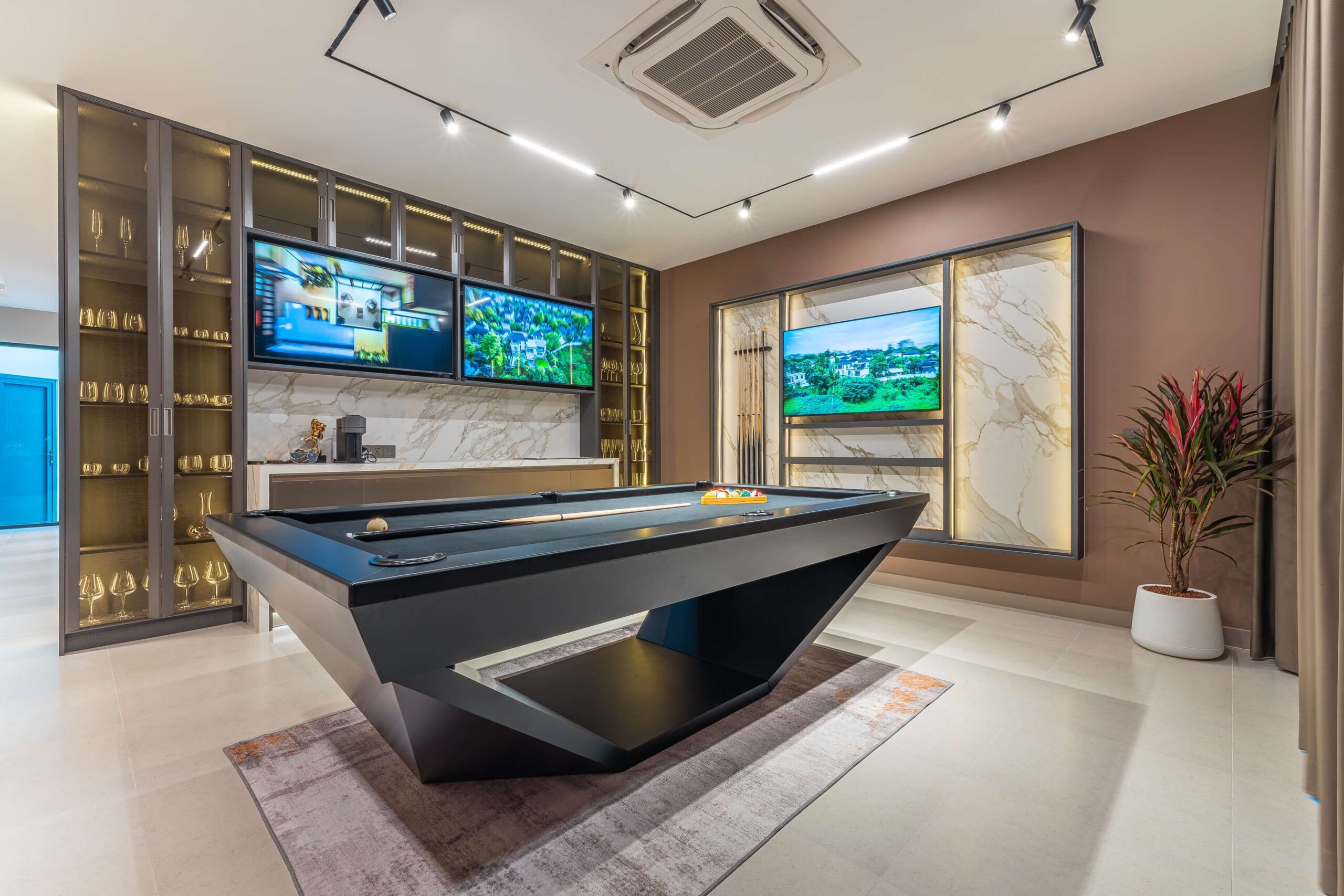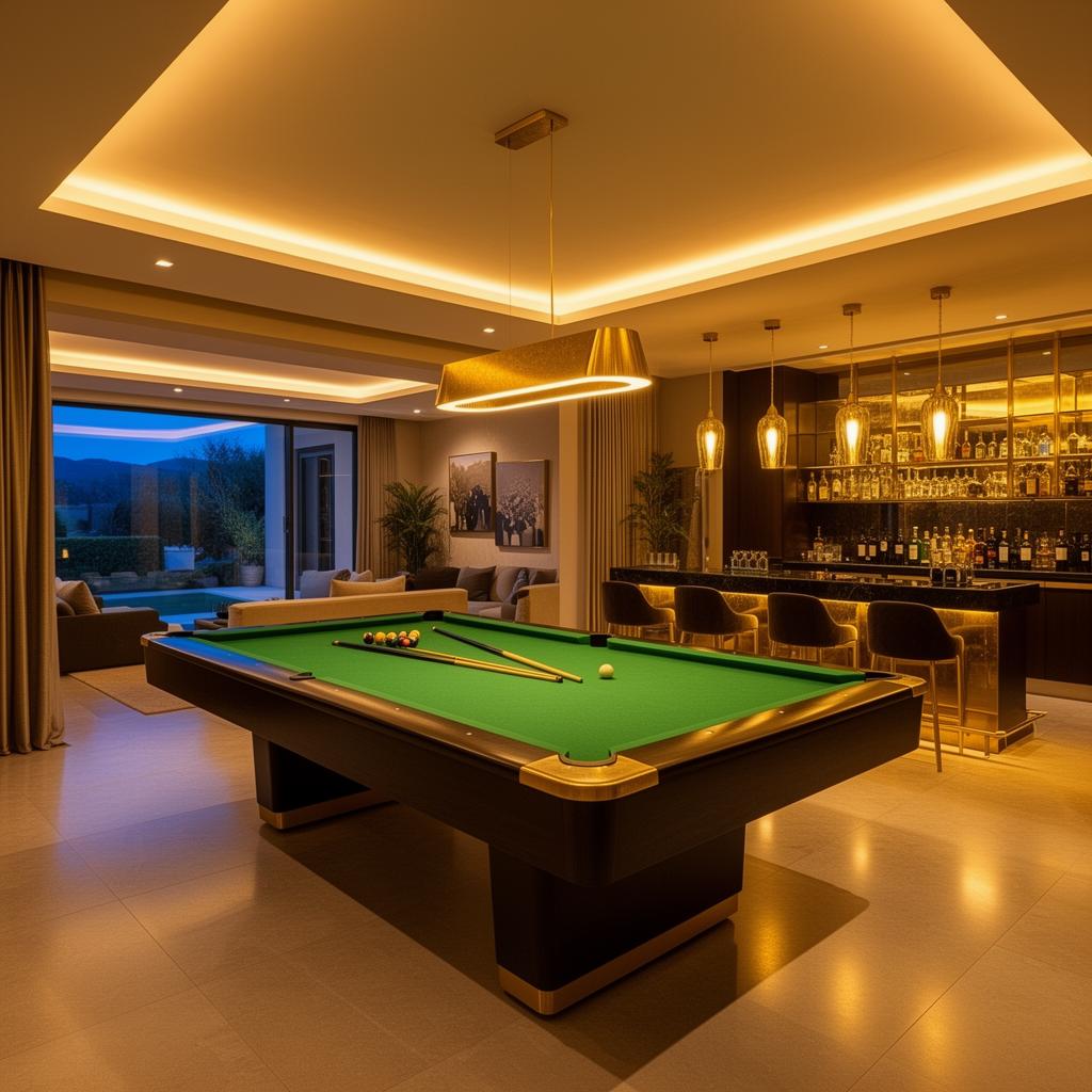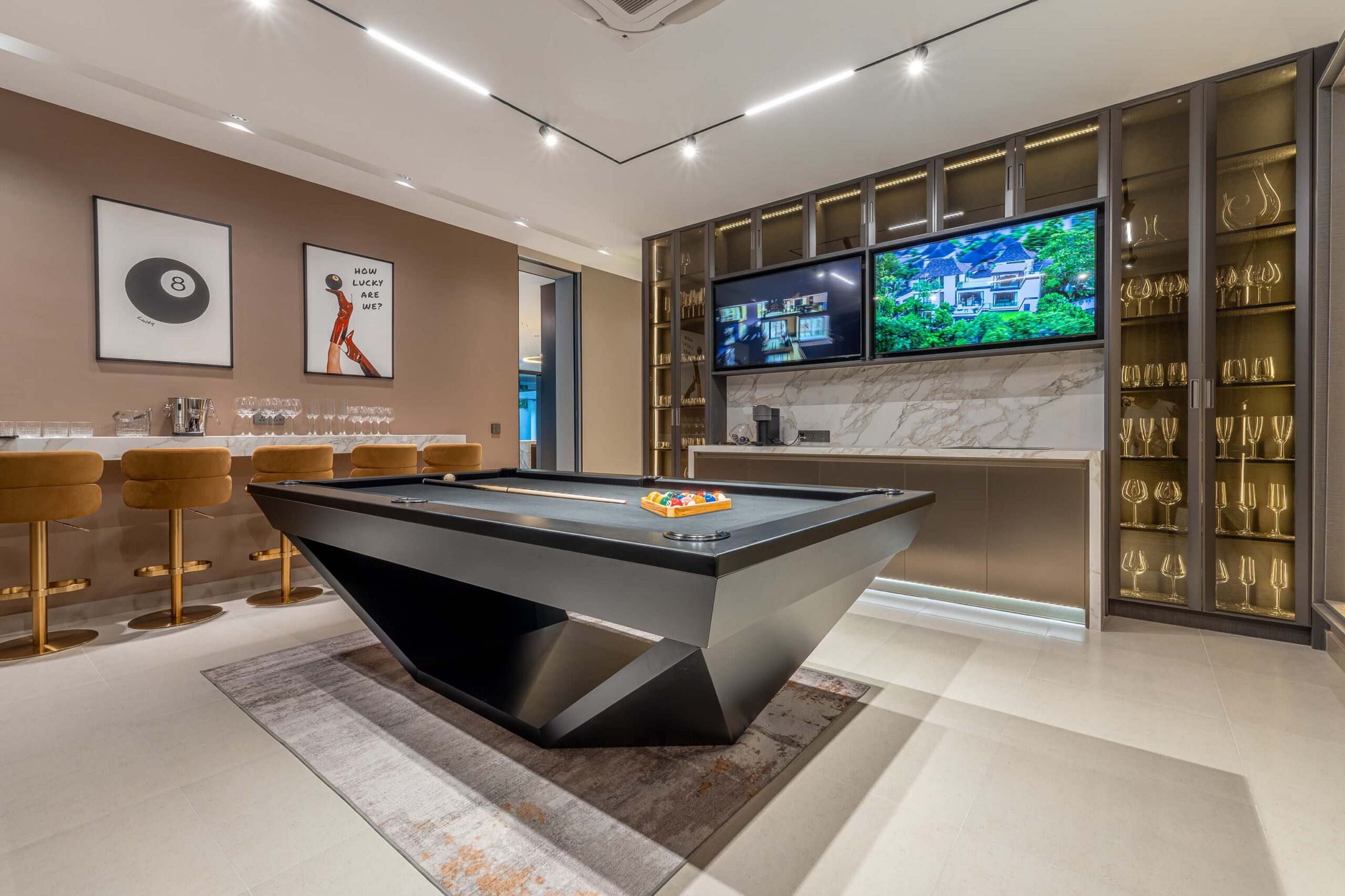 A game room with pool table, wet bar with wine fridge, and wine storage room with climate control.