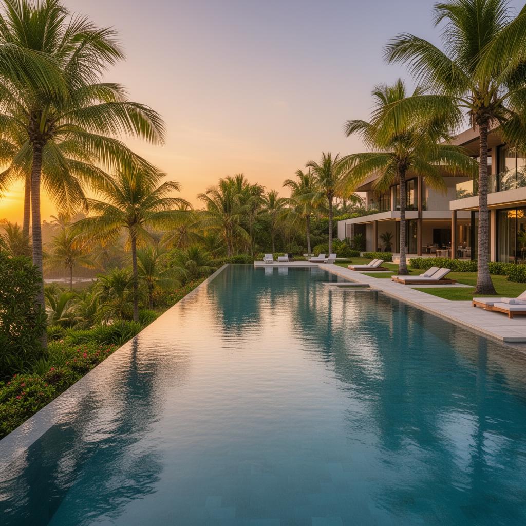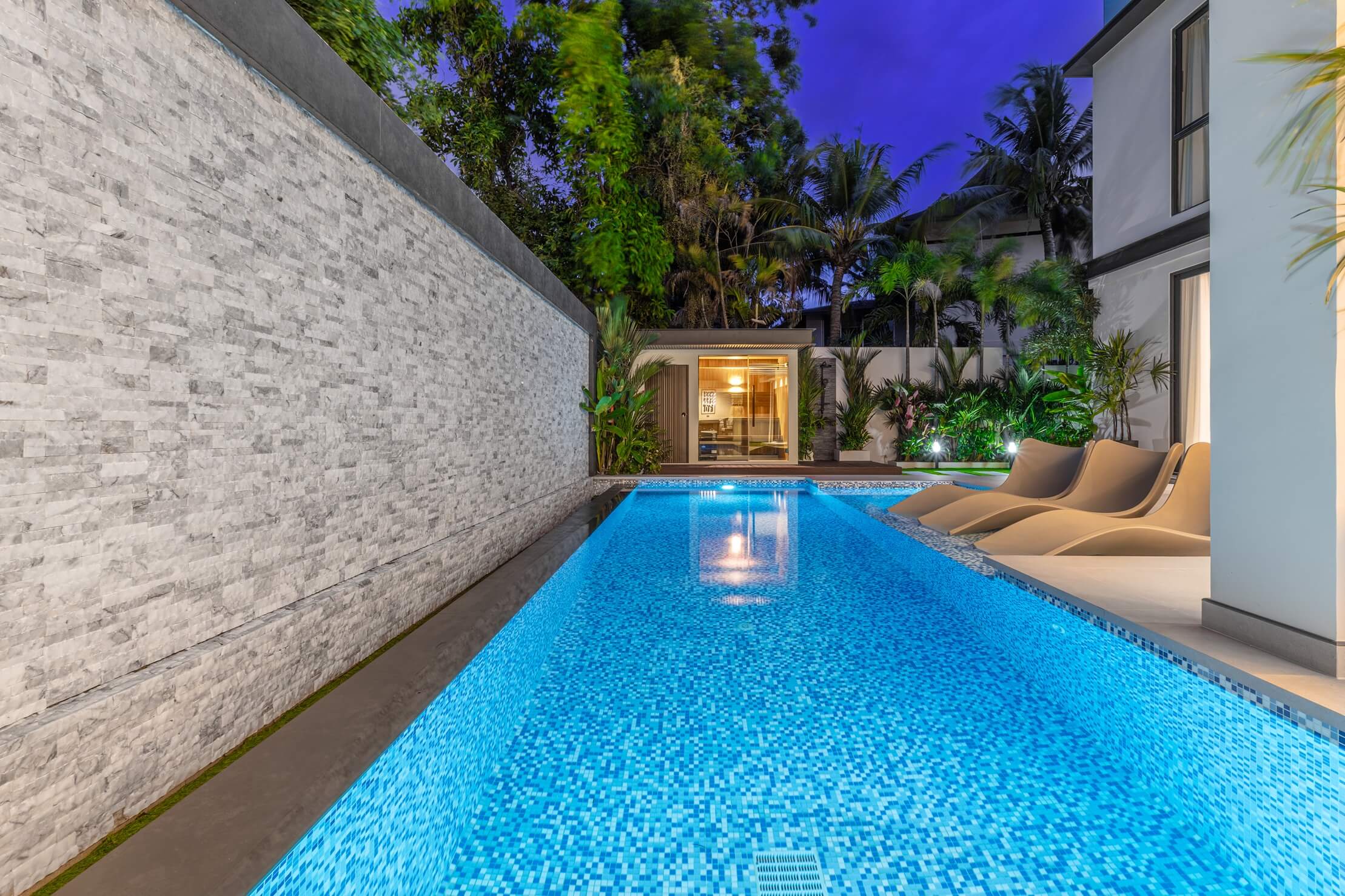 Unwind by the shimmering pool or relax in the private sauna, surrounded by lush tropical landscaping.